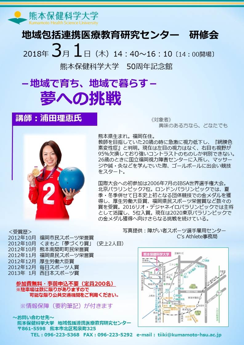 | 名称 | 熊本保健科学大学 地域包括連携医療教育研究センター研修会 -地域で育ち、地域で暮らす- 夢への挑戦 講師:浦田理恵 |